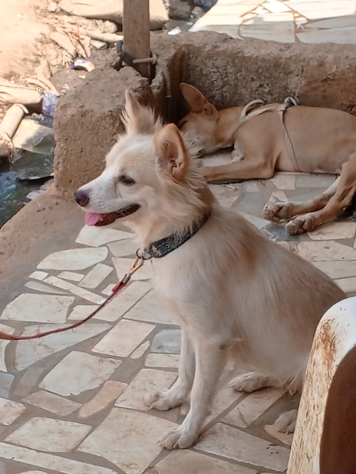 The image depicts two dogs within an outdoor, semi-urban environment. In the foreground, a light cream-colored dog with upright ears and a fluffy coat is seated, facing left in profile. It wears a patterned dark collar with a red leash attached to it; its mouth is slightly open, revealing a pink tongue. Behind and to the right of the sitting dog, a second light brown dog lies prone, appearing to rest or sleep. This dog has a light-colored harness visible on its back. Both dogs are situated on a paved surface composed of irregularly shaped, light-toned tiles. The background features a rustic, earthen-toned structure or wall behind the sitting dog, with a wooden post secured to it. To the far left, the background shows an unpaved area littered with debris, including plastic materials, and what appears to be a small body of water or liquid. The lighting suggests daylight conditions. While the specific address or landmark in Abuja, Nigeria, cannot be determined from the image alone, the setting is consistent with an informal residential or semi-urban area within the city. No human subjects are visible, and there are no discernible interactions between the dogs or other entities beyond their static positions.