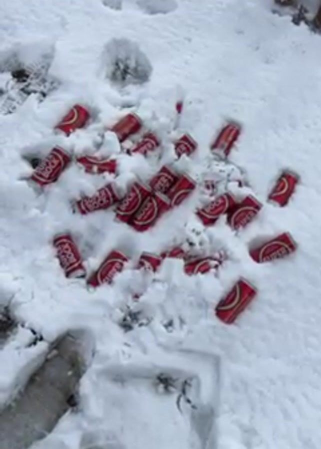 The scene shows a snowy landscape with approximately 20 red and white Super Bock beer cans scattered on the snow-covered ground