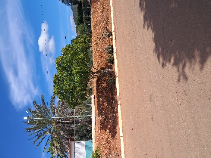 A sideways view of a tropical scene. A palm tree and leafy green tree border a paved road. The trees stand between the road and a chain-link fence. Beyond the fence are more green trees and a distant mountain. A vibrant blue sky is filled with fluffy white clouds, and a power line cuts across the sky. The sun casts tree shadows on the road.