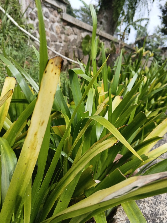 A close-up shot captures lush, green lily plants. Some blades display yellowing and brown tips, suggesting possible distress. The plants are clustered together. In the background, a stone wall and a glimpse of foliage create a sense of depth, hinting at a garden setting. A faint strand of a spiderweb is visible among the leaves. The composition emphasizes the plant's texture and the contrast between healthy and fading foliage.