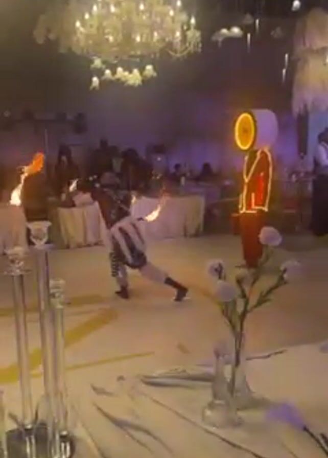 fire performer and a person dressed in a drum costume performing at an event. The fire performer, dressed in a black and white costume, spins flaming batons. A person in a red drum costume stands nearby with lights outlining the drum. They are on a light tan dance floor. There are tables with decorations and people in the background and a chandelier hanging from the ceiling. Lighting effects alternate between white and blue.