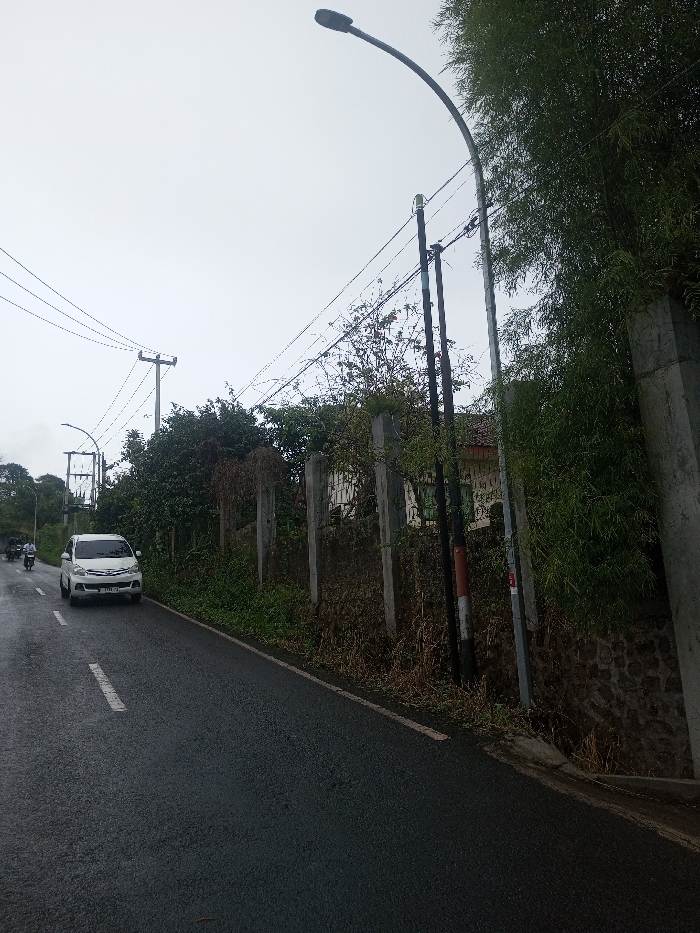 The scene is a public road in Babaliya Mal., India, observed under an overcast sky. The asphalt roadway, appearing wet, features a white dashed centerline and a continuous white line marking the left shoulder. A white multi-purpose vehicle (MPV) with a front license plate is positioned on the left lane, oriented towards the viewer. Further down the road, a motorcycle with a single rider is visible traveling in the same direction as the MPV. On the right side of the road, a low stone wall is topped by a series of vertical concrete posts. Dense green vegetation, including tall, slender-leafed plants and various bushes, grows alongside the road and behind the wall, partially obscuring a light-colored residential structure with a tiled roof. Multiple utility poles, some wooden and some concrete, support a network of overhead electrical wires. A modern street light with a dark, curved arm is prominent on the right, extending over the roadway. A second street light is visible in the distance on the left.