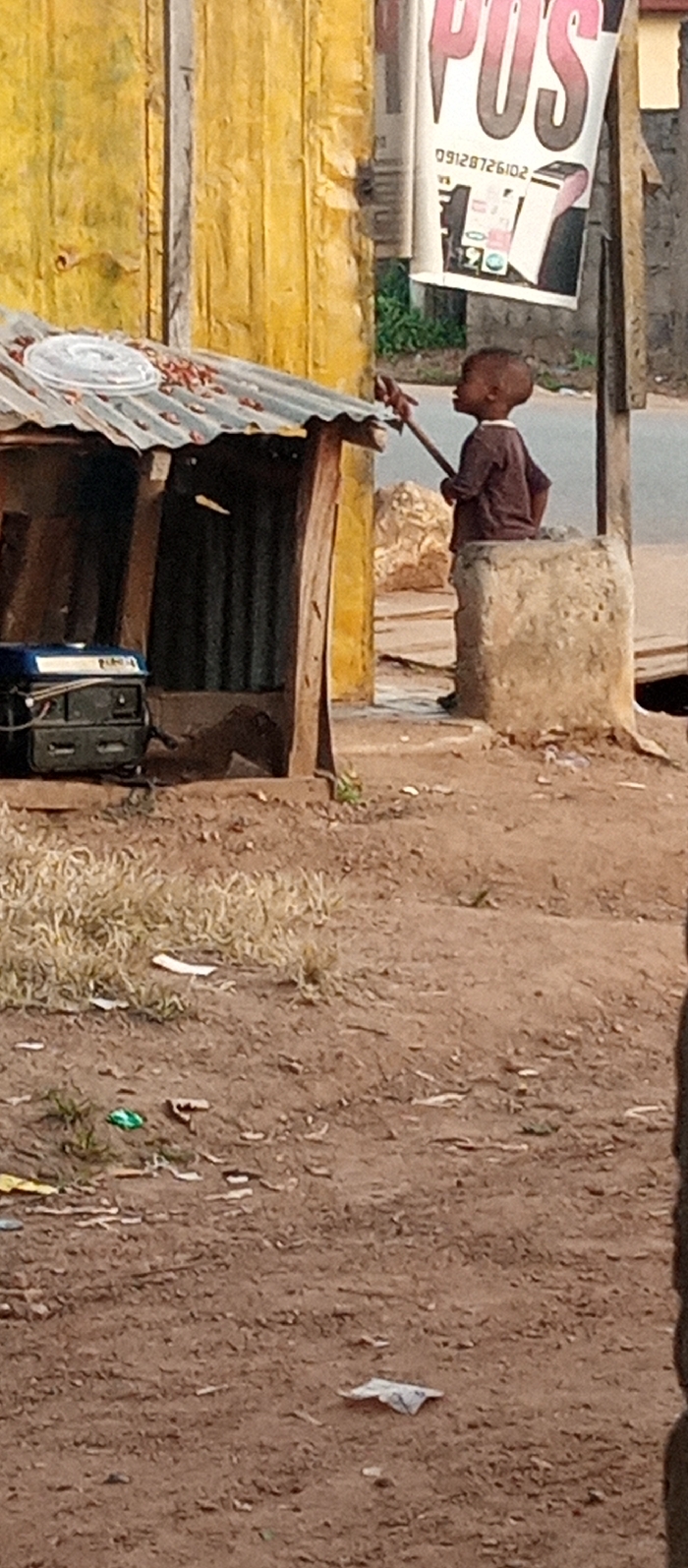 The image portrays an outdoor scene in Akwanga, Nigeria, depicting a young child and several structures adjacent to a road