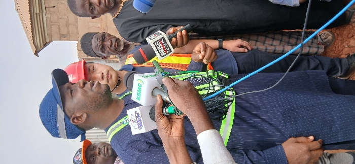 A group of individuals is assembled outdoors in Rigasa, Nigeria. The central figure, an adult male with a dark complexion, wears a blue baseball cap with a grey stripe, a dark blue long-sleeved tunic with light pinstripes, and a neon yellow-green reflective safety vest. He is speaking, with his mouth open, while facing towards the right side of the frame. Several microphones are held towards him from the foreground, displaying logos for 'UNIAU PROJECT,' 'KSMC,' and 'ARISE NEWS,' alongside a plain blue microphone. Multiple hands, predominantly dark-skinned, are visible holding these microphones. Behind the central speaker, to his right, a younger East Asian male is visible wearing a red hard hat, a dark blue shirt, and a yellow-orange reflective safety vest. Further to the right, an elderly dark-complexioned male with a grey beard wears a black kufi cap and a brown traditional garment. Another dark-complexioned male in a black traditional garment with gold embroidery is partially visible on the far right. The ground surface is reddish-brown earth. In the background, a building with a corrugated metal roof and light-colored concrete block walls is partially visible on the upper right. The sky above appears bright and clear or lightly overcast.