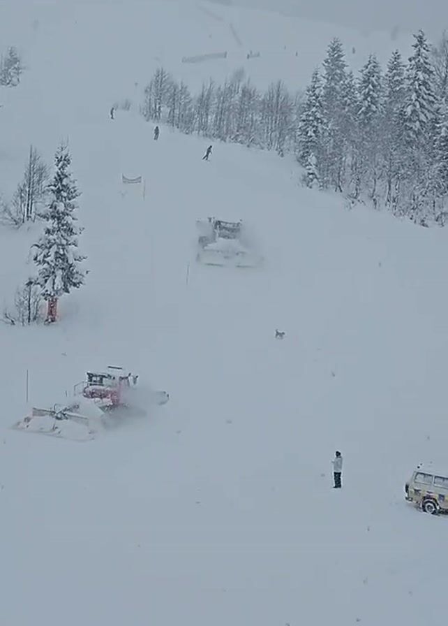 The scene is a snow-covered ski resort on a day with active snowfall. Several snow groomers, are working on the hill. Some skiers and snowboarders are on the slope. A lone figure stands in the foreground near the base of the hill. A small dog is moving about on the slope, near the groomers. A building is visible on the right side of the frame. The view is from an elevated position, likely a balcony or window.