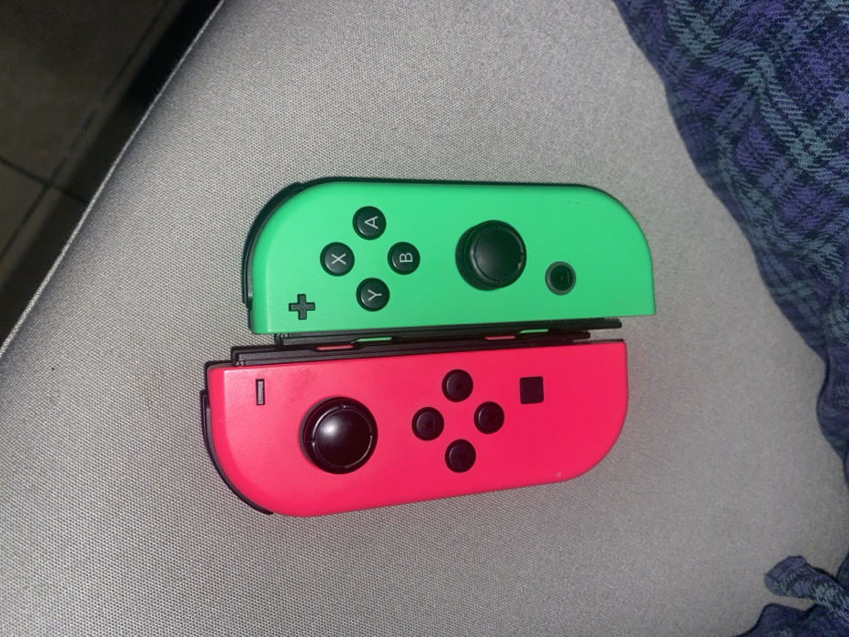 - "Two Nintendo Switch Joy-Cons are stacked on top of each other, laying on a gray textured surface, possibly upholstery" by FM-TO6gh1, licensed under CC BY 4.0