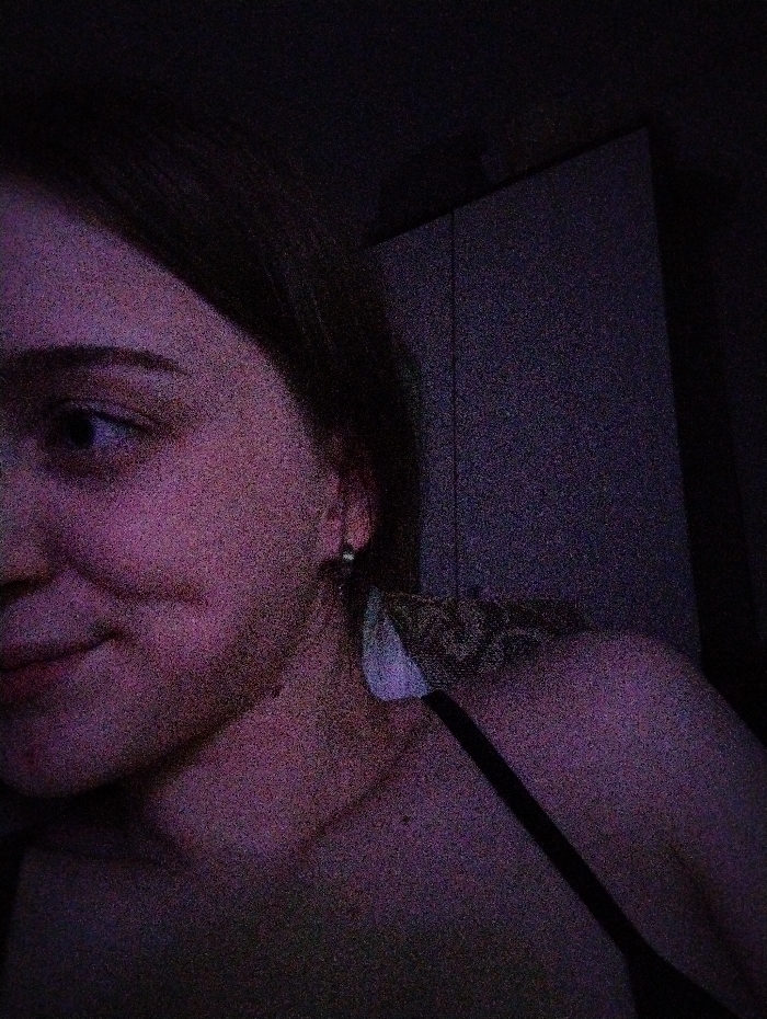 The image depicts an indoor scene in Saratov, Russia, characterized by low light and high visual noise, giving it a grainy, purple-red cast. A young female is positioned in the left half of the frame, visible from the upper chest. She has fair skin and dark hair, with her left eye looking towards the viewer's left. Her lips are curved into a subtle smile, creating a dimple on her left cheek. A small, silver-toned hoop earring is present in her left ear. She wears a dark strap over her right shoulder, consistent with a top or undergarment. Resting on her right shoulder (viewer's right) is a snake, its patterned scales, possibly dark and light brown, indistinct due to lighting. A piece of white fabric is visible beneath the snake on her shoulder. The background to the right consists of a dark, flat surface, likely furniture or a wall, indicating an enclosed room. The interaction suggests the female is comfortable with the snake on her shoulder.