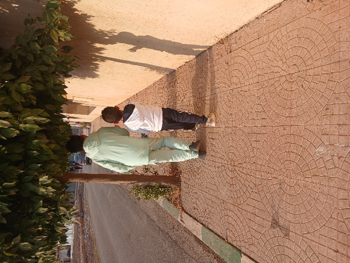 Two boys stand on a patterned sidewalk. One boy wears a light green outfit, and the other sports a white shirt and dark pants. A tree with abundant green foliage and a tree trunk are present. Adjacent to the sidewalk, a road with parked cars is visible. The scene is brightly lit, casting shadows on the pavement.