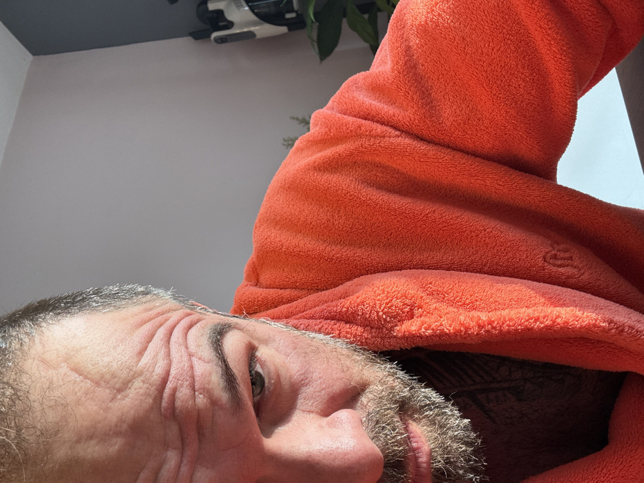 The image depicts an adult male, partially visible in an indoor setting in Marche-en-Famenne, Belgium. The subject's face, upper torso, and right arm are present, angled towards the left. He has greyish, short hair, a receding hairline, and prominent forehead wrinkles. His left eye is visible, directed towards the viewer. A full, greyish beard covers his jawline and chin. He is wearing a bright orange, textured bathrobe, underneath which a dark, possibly patterned garment is discernible on his left side. The background features a pale-colored wall in the upper center and right, meeting a darker wall in the upper right corner. An upright, light-colored object, resembling an appliance, is positioned in the upper right. Green plant foliage is partially visible in the lower right, behind the subject's arm. A dark surface is present below his right arm. Strong illumination from the left casts highlights on his left facial features and creates shadows on his right side.