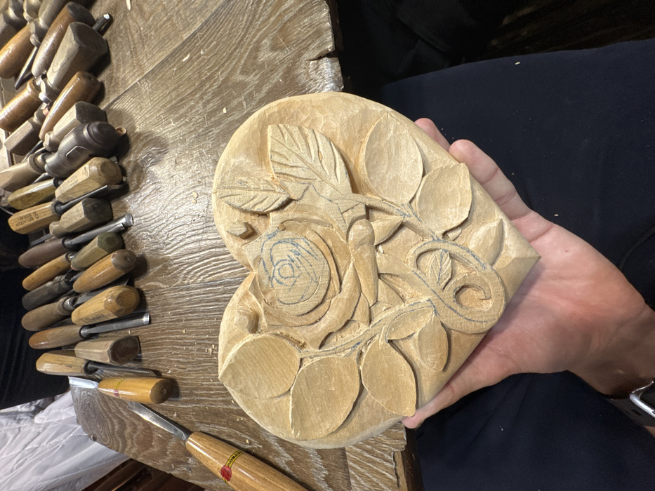 - "The image presents a close-up, top-down view of a partially carved wooden heart-shaped object held by an individual's left hand in what appears to be a woodworking workshop in Shumen, Bulgaria" by FM-TdMfR2, licensed under CC BY 4.0