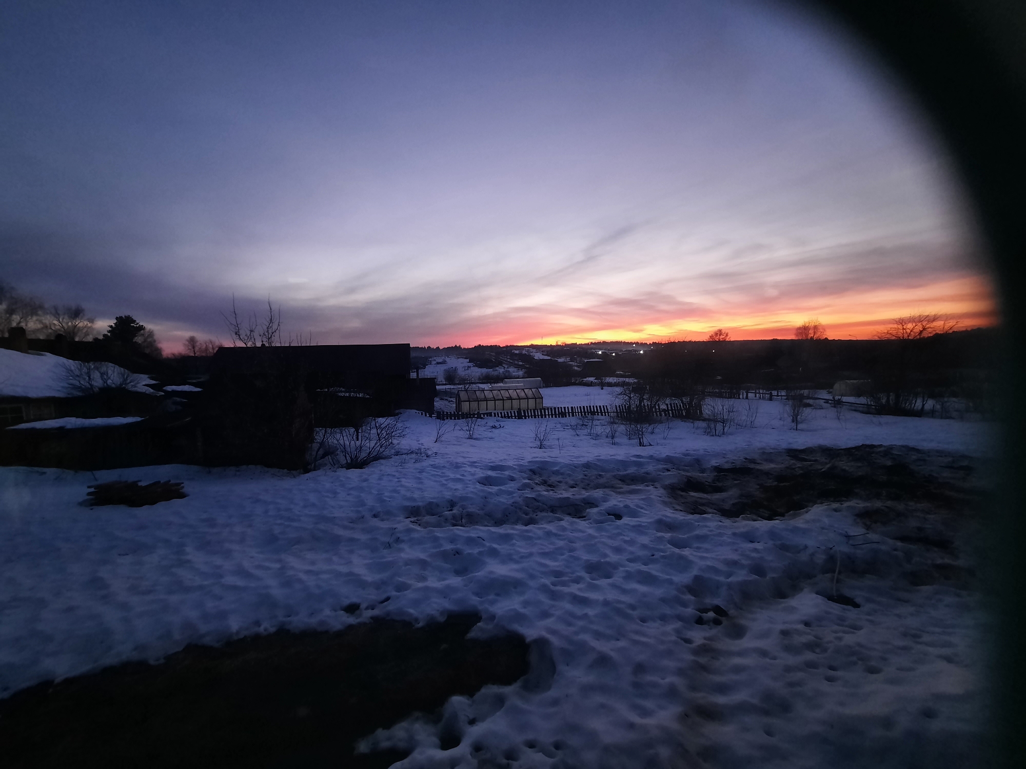 The image presents a winter or early spring landscape at dusk in Krasnogorskoye, Russia. The sky, occupying the upper portion of the frame, exhibits a distinct color gradient: deep indigo in the upper left transitions through purple and light blue to a vibrant band of pink, orange, and red along the horizon, indicating a sunset. Wispy, horizontally stretched clouds are visible across the sky. The foreground consists of uneven, snow-covered terrain, interspersed with patches of dark, exposed earth or mud. The snow surface is textured with visible depressions and undulations. In the mid-ground, several dark silhouettes of buildings, likely residential or utility structures, are visible against the fading light. A prominent, translucent, tunnel-shaped greenhouse with an internal frame is centrally located, bordered by a low, weathered wooden fence. A stack of dark logs is observed resting on a snow patch in the mid-left area. Numerous bare deciduous trees and shrubs are scattered across the landscape, particularly along the mid-ground and distant horizon line. In the far background, a faint line of artificial lights indicates a distant populated area. The scene is illuminated by the ambient light of twilight. No individuals, animals, or active interactions are visible. A dark, curvilinear obstruction is present along the extreme right edge of the image frame.