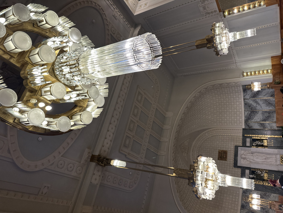 This image depicts the ornate interior of the Municipal House (Obecní dům) in Prague, Czechia, likely one of its grand halls such as Smetana Hall. The scene is dominated by elaborate Art Nouveau/Art Deco architectural features, primarily illuminated by several large chandeliers. The ceiling is high, vaulted, and off-white, adorned with intricate molded plasterwork featuring repeating geometric patterns, including squares, circles, and linear cornices. Suspended from the ceiling are three prominent, multi-tiered chandeliers with golden metal frames and clear or frosted glass components. The largest chandelier, positioned centrally and in the upper right foreground, features a wide golden ring supporting numerous white spherical and rectangular glass diffusers. Below this ring, a long, dense cylindrical cascade of clear glass rods or crystals forms the primary light source, tapering slightly downwards. To the lower left, a smaller but equally elaborate chandelier hangs suspended by long, slender golden rods. It exhibits a similar multi-tiered design with a circular arrangement of rectangular glass elements surrounding a central cylindrical cascade of clear glass rods or crystals. A third, similar chandelier is partially visible on the lower right. The walls display complex patterns and textures. On the left, a large arched section features intricate, scale-like or tiled patterns. The lower wall sections incorporate dark, possibly marble or patterned tile panels, interspersed with lighter decorative sections. Beneath the mid-ground chandelier, a large white sculptural relief, depicting a standing male figure, is integrated into the wall, flanked by vertical golden decorative elements. Vertical light fixtures, appearing as tall, illuminated columns with golden frames, are visible along the walls. A few indistinct figures are present in the lower portion of the frame, visible primarily as heads or shoulders, suggesting an audience or attendees. One individual in the lower left foreground has discernible red hair. No specific actions or interactions are clearly visible among these individuals.