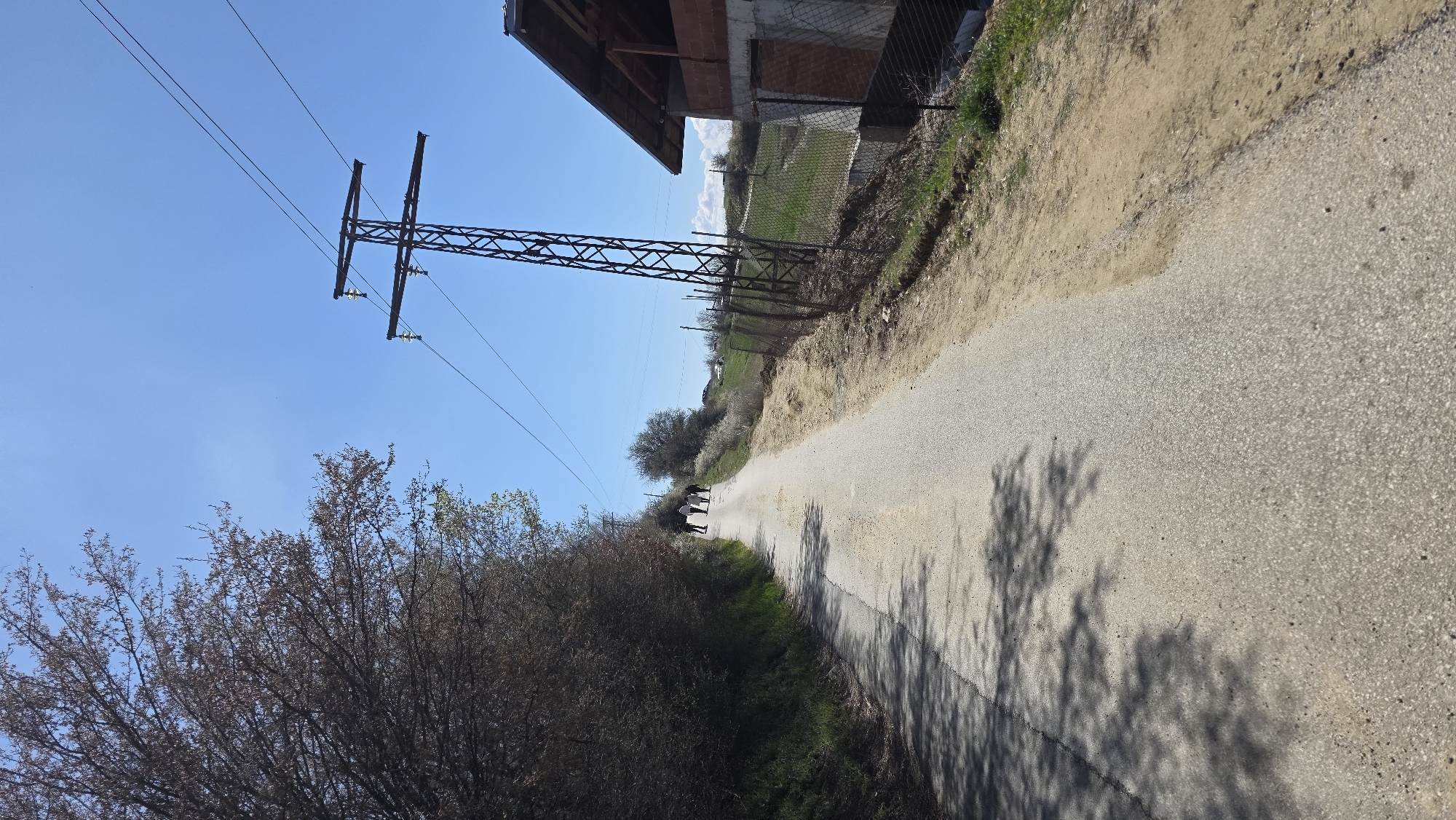 slightly angled view of a road leading through Marulevo, Bulgaria. An electrical power line tower stands to the left, with power lines stretching across the clear blue sky. A partially constructed building sits adjacent to the road, enclosed by a chain-link fence. The road is bordered by vegetation, including trees with budding leaves and scrub brush. Further down the road, there are approximately four people walking. Tree shadows fall across the paved surface of the road. A dirt embankment runs along the right side of the road.