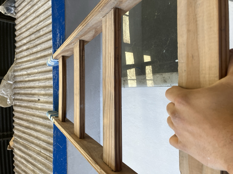 A framed window is held in place by a hand. The wooden frame consists of rectangular posts and crossbars. The glass pane is partially visible. Outside, corrugated metal siding is mounted to a blue wall. Mounting materials are visible between the frame and the wall. The window is in an indoor setting with a light-colored wall visible through the glass.