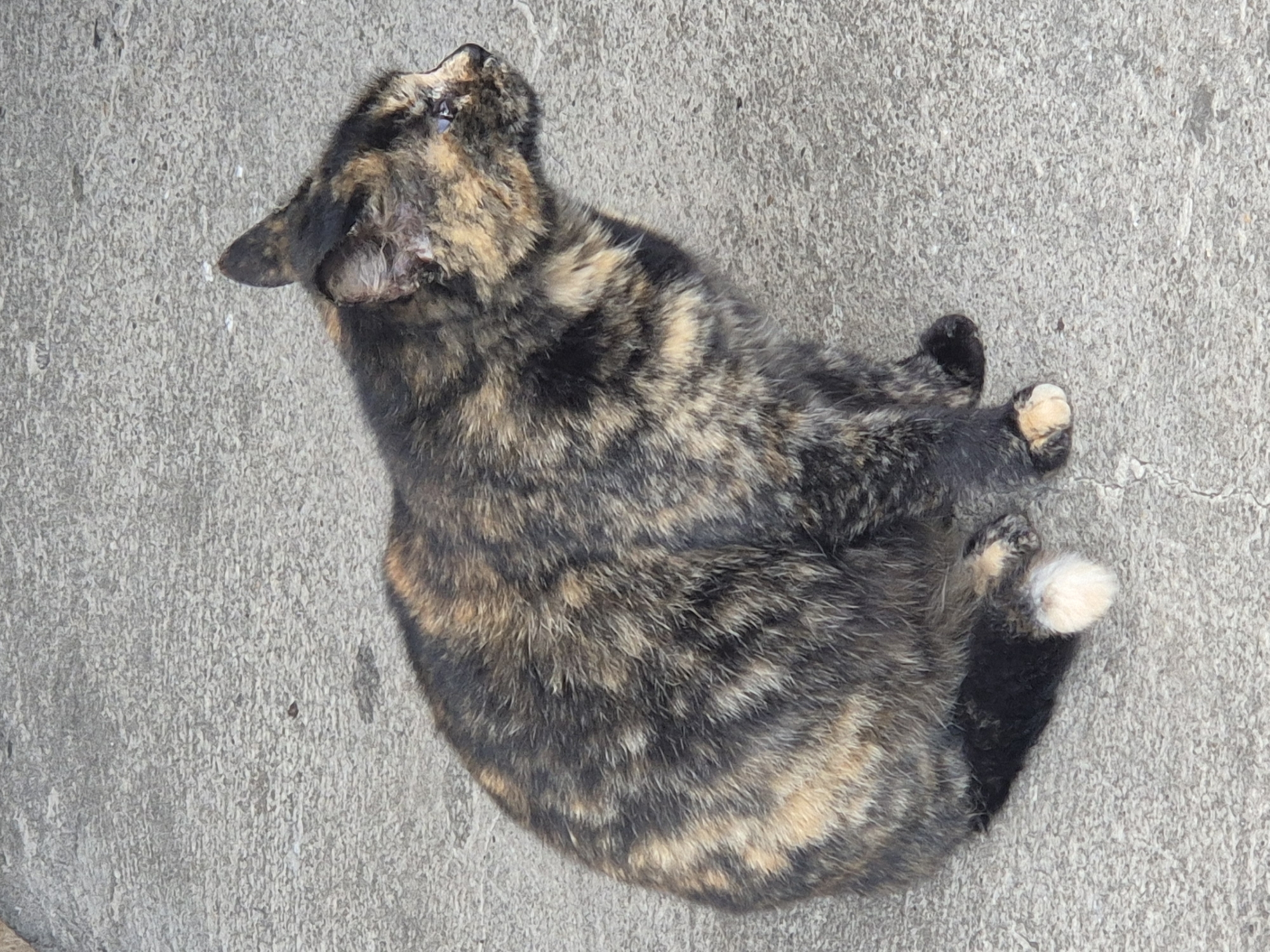 A tortoiseshell cat lies on its back on a light gray concrete surface
