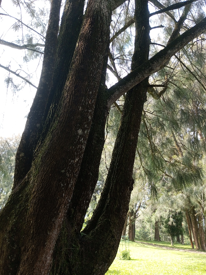 This image depicts a natural outdoor scene within a park or treed area in the city of New Serchhip, India. The foreground is dominated by a cluster of at least three robust tree trunks, characterized by dark brown, heavily textured bark with visible patches of green moss or lichen. These trunks rise diagonally from the lower-left, partially silhouetted against a bright, hazy sky in the upper-left portion of the frame. Beyond the foreground trees, a manicured grassy lawn extends into the midground, brightly illuminated by diffuse sunlight. To the right and extending into the background, a distinct line of additional tall, slender coniferous trees with drooping, needle-like green foliage forms a prominent feature. A small, light-colored metal structure, possibly a low fence or support, is faintly visible within the grassy area to the left of the distant tree line. No individuals or animals are present. The scene is uniformly lit, suggesting a bright day with either an overcast sky or significant atmospheric diffusion of sunlight.