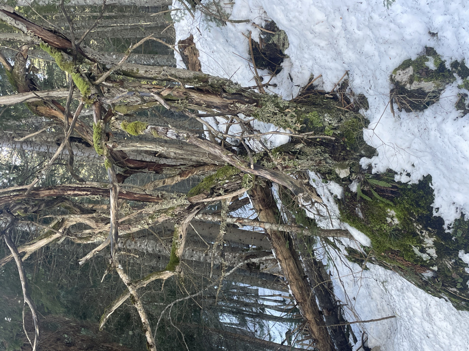 This image displays a snowy winter forest scene in the vicinity of Pitomine, Montenegro. In the immediate foreground, a prominent, gnarled tree dominates the frame, characterized by multiple interconnected trunks and numerous bare, twisted branches. The tree's bark exhibits a mixture of light and dark brown tones, heavily textured with patches of vibrant green moss and lighter grey-green lichen. The ground is uniformly covered by a layer of white snow, which partially obscures rocks and the bases of trees. Scattered patches of dark green moss and some fern-like vegetation are visible where the snow has receded from rocks and tree roots in the lower foreground. In the midground, a substantial fallen log, dark brown and partially covered in snow, extends horizontally across the frame. The background consists of a dense coniferous forest, with numerous tall, slender trees exhibiting dark trunks and evergreen foliage, contributing to a deep and shaded atmosphere. No individuals or explicit signs of human activity, actions, or interactions are discernible within the visible scene. The environment indicates a cold, natural wilderness setting under natural daylight conditions.