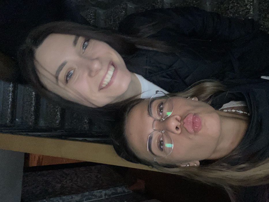 The image displays two adult females in an indoor setting