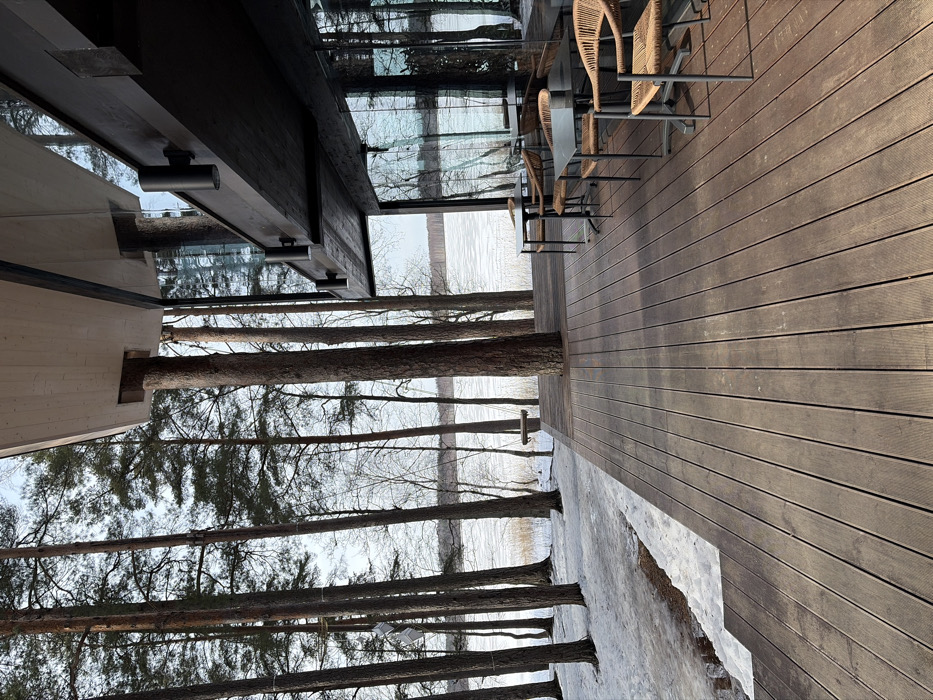 The scene depicts a modern outdoor area in Kerro, Russia, overlooking a frozen body of water bordered by a pine forest. In the foreground, a large wooden deck extends from a contemporary building featuring dark-colored exterior walls and extensive glass panels that reflect the surrounding trees and sky. Several outdoor tables with dark rectangular tops and dark metal bases are arranged on the deck, each paired with chairs composed of dark metal frames and light-brown woven seats and backs. Three such tables and six chairs are clearly visible. A prominent pine tree trunk emerges directly from the deck, passing through an opening in the building's light-colored wooden overhang above. Along the building's dark exterior wall, multiple cylindrical, dark-colored wall lights are mounted. Beyond the deck, the ground slopes down towards the water, covered in patches of melting snow and exposed earth, with a pathway visible to the left. A dense stand of tall, slender pine trees, characteristic of a boreal forest, dominates the middle ground and extends into the background on either side. Near the water's edge, a simple wooden swing hangs from one of the trees. The expansive body of water in the distance is covered by a layer of ice and snow, reflecting a light sky, with some bare reeds or shrubs visible along its immediate edge. No individuals are present in the image.