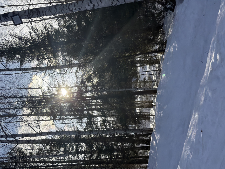 The image presents a winter forest scene in Gubakha, Russia. The foreground is dominated by an undulating expanse of white snow, exhibiting bright sunlit areas and sections in shadow with a bluish tint. The middle ground and background consist of a dense forest composed of both bare deciduous trees, identifiable as birches by their distinct white and dark-marked bark, and dark green coniferous trees. Bright sunlight emanates from the upper-center-left, producing visible sunbeams and lens flare that penetrate the tree canopy. A rectangular, dark-colored object is attached high on the trunk of a birch tree positioned on the far right. The sky, partially visible through the upper tree branches, is light blue with sparse, faint white clouds. No individuals or specific activities are observed.