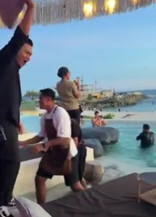 The video captures a scene at what appears to be a beachside or poolside lounge area during the day, possibly evening. The setting includes a shallow pool or lagoon-like feature, an artificial beach area with white sand, and a breakwater visible in the background. Several people are involved in a playful interaction, centered around throwing pillows. A man dressed in black throws a gray pillow at individuals who are already in the water, who seem to be enjoying themselves. Another person, possibly a staff member, stands on a platform taking photos or videos of the event. The area is decorated with string lights. The overall atmosphere seems casual and festive.