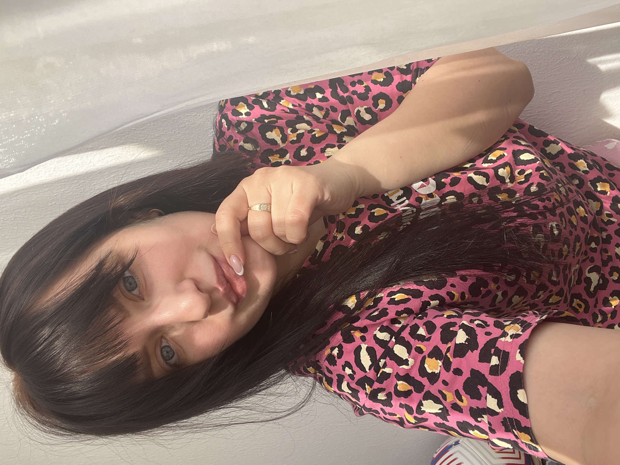 A young woman is lying down, partially covered by a white sheet or curtain. She has dark hair with bangs, fair skin, and light-colored eyes. She is wearing a pink leopard-print top and a gold ring is visible on her finger. Her hand is resting on her cheek. The location appears to be indoors, possibly in a residential setting in Марковский, Russia. The environment is bright and possibly sunny, with light coming from above.