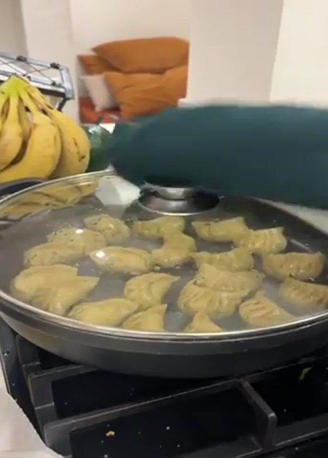 someone removing the lid from a large frying pan full of dumplings cooking on a gas stovetop. The dumplings are light brown and arranged closely together in a single layer. Steam rises from the pan. To the left, out of focus, are a bunch of bananas, an avocado, and a wire rack. In the background, indistinct, are some cushions and part of a white wall. The person's arm, clad in a green sleeve, is briefly visible removing the lid.