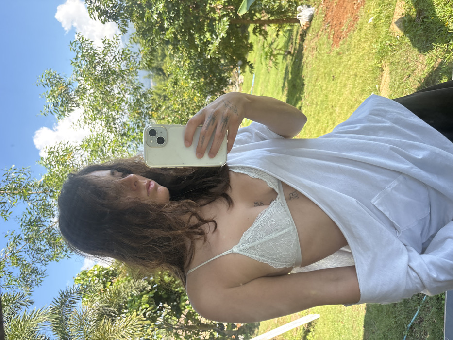 A woman holds a smartphone taking a selfie outdoors. She wears a white lace bra and a partially open white shirt. Tattoos are visible on her hand and chest. The background includes lush greenery, trees, grass, and a bright blue sky with clouds. The image is shot at a slight angle, creating a casual, informal vibe.