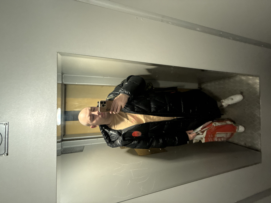 A male individual is observed taking a selfie inside an elevator located in Pleven, Bulgaria. The subject, bald with fair skin, wears a light beige long-sleeved shirt, a shiny black long puffer coat with a circular red and white patch on the left side, and white sneakers. He holds a light-colored smartphone to his face with his right hand, seemingly capturing his reflection in the elevator's mirror. His eyes appear to be closed. In his left hand, he carries a red and white plastic shopping bag. The elevator interior features light grey or metallic walls, with visible scratches on the left wall, and a diamond-plate patterned metallic floor. Reflected in the mirror, behind the subject, is a light yellow/beige elevator panel and an overhead light source. A metallic panel with fasteners is visible at the top of the frame, above the mirror.