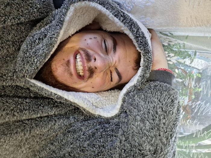 The image depicts a close-up, upward-angled view of a male individual indoors, located in the city of Rakitovo, Bulgaria. The subject is wearing a grey, textured, faux-fur hooded garment with a white sherpa lining visible inside the hood. He exhibits a strained facial expression, with both eyes tightly squinted shut, furrowed eyebrows, and an open mouth revealing a wide grin with visible upper and lower teeth. His face shows several distinct dark moles on the right cheek and forehead, and he has a light brown beard/stubble. A red string or bracelet is visible on his left wrist, which is partially covered by a dark grey long-sleeved garment. The background consists of a white, possibly patterned curtain on the left and a blurred window view behind the subject's head, showing green foliage and indistinct structures, partially obscured by what appears to be a sheer curtain or screen.