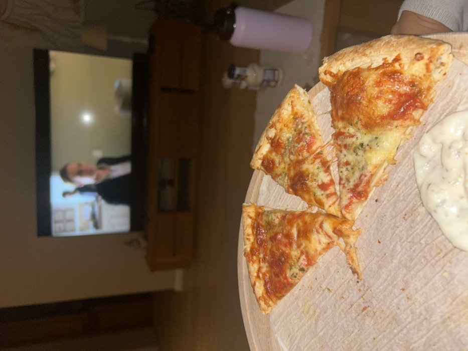 The image captures an indoor scene within a residence in Schenefeld, Germany, observed under dim lighting conditions. In the immediate foreground, a circular wooden pizza board is held by a person, with a portion of their hand visible on the lower right. The board contains four slices of pizza, consisting of a tomato sauce base, melted cheese, and green herb garnishes; one slice exhibits a missing portion consistent with a bite. A small, white, circular dish containing a light-colored, creamy dip with visible herb flecks is also positioned on the board. The board itself is lined with a sheet of light-colored material, possibly parchment paper, showing grease stains. In the midground, to the right of the pizza, a light purple insulated water bottle with a black cap and two clear spice shakers are visible on a surface, likely a low table. The shakers contain light-colored granulated substances. The background is out of focus, revealing a large, black flat-screen television centrally placed on a brown wooden media console. The television screen displays a visual scene featuring a female individual, dressed in a dark blazer over a white shirt, in the foreground. A male figure is discernible in the background of the screen, within what appears to be a kitchen environment. The floor, visible in the background, is a light-colored hard surface. The overall scene suggests a domestic setting, consistent with a living room or recreational area.