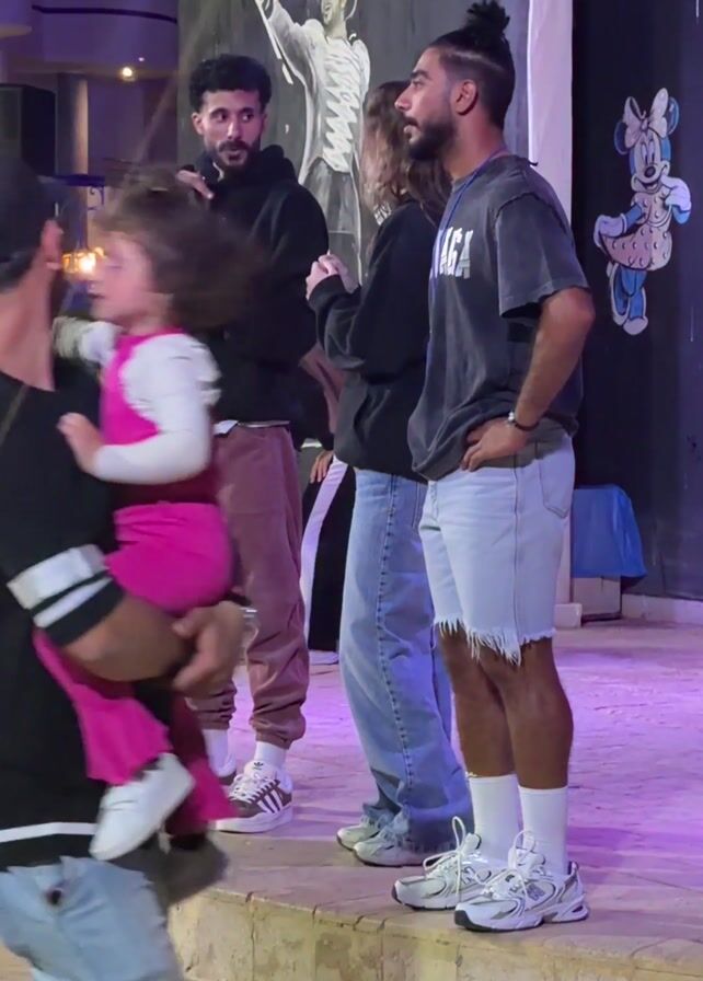 A group of people are standing on a stage, with a man holding a microphone and a small plastic bottle. The man with the microphone is wearing a black hoodie, pink trousers, and Adidas sneakers. To his right, a woman in jeans and a black hoodie stands beside a man in a gray shirt, denim shorts, white socks, and sneakers. Behind the group, there is a painted backdrop with images of a man in a hat and a cartoon Minnie Mouse. In the foreground, a man in a black baseball cap enters the frame, carrying a toddler in pink. The stage is illuminated with a purple light.