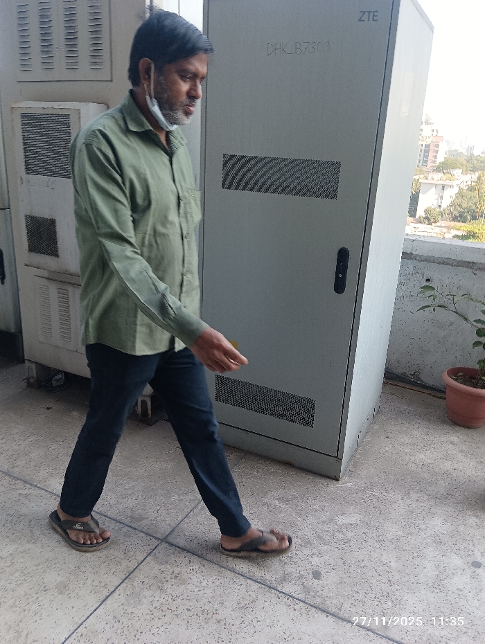 A man in a green shirt and dark pants walks across a tiled surface. He wears sandals and has a mask hanging on his face. Behind him is a large gray electrical box with the word "ZTE" printed on it, and to its side is a potted plant on a ledge. Air conditioning units are situated behind the man. The date "27/11/2025" is faintly visible in the lower right corner.