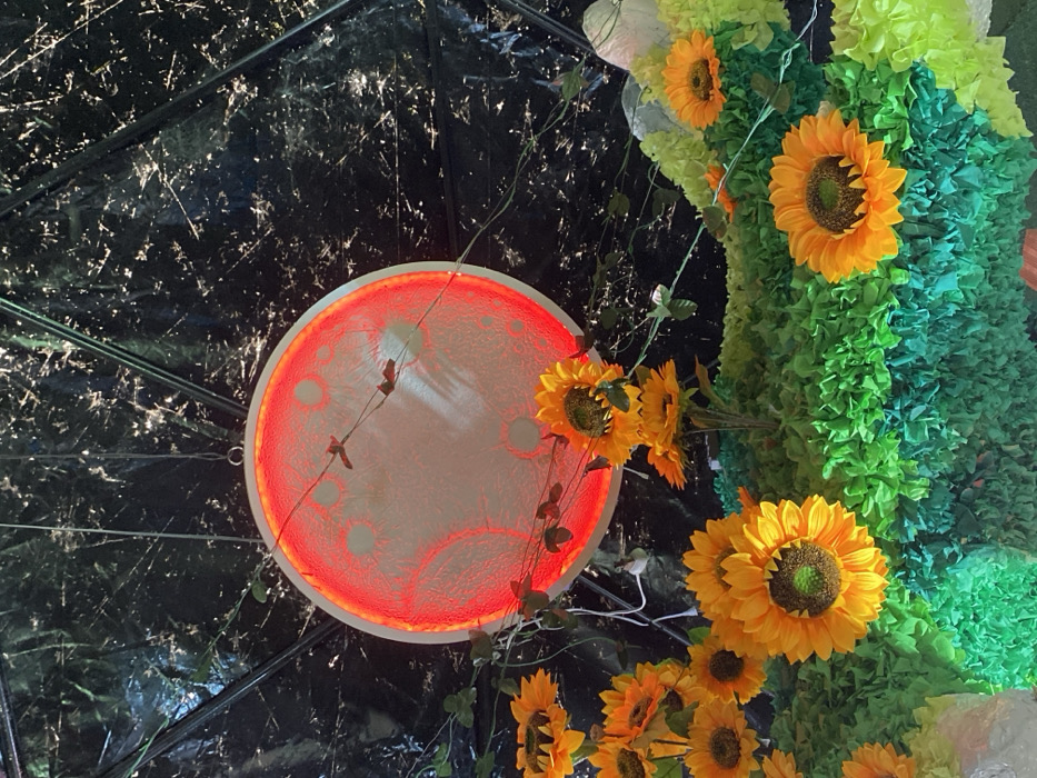The scene presents an illuminated, static display, confirmed to be located in the city of La Paz, Bolivia. A large, circular light fixture, prominent in the upper frame, emits a red glow around its perimeter and features a white, translucent interior surface with irregular, crater-like textures. This fixture is suspended by multiple thin wires against a dark, reflective, and crumpled backdrop, consistent with black plastic sheeting, which also reveals faint structural supports in the upper left and right. In the foreground and midground, a dense arrangement of artificial sunflowers is visible, characterized by bright yellow petals and dark centers. These sunflowers emerge from an undulating, sculpted base composed of numerous layers of crumpled green material, likely fabric or paper, transitioning in color from dark to lighter green. Several thin vines or wires with small, dark, winged adornments are draped across the display, interacting with the light fixture and sunflowers. No individuals are present in the image.