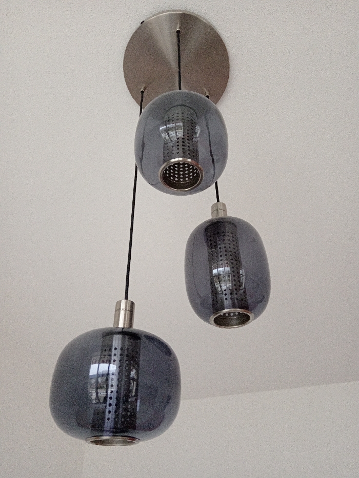 The image displays a close-up, upward-angled view of a modern multi-light pendant fixture attached to a light-colored, textured ceiling. The fixture consists of a circular, brushed metal ceiling plate, from which three black electrical cords extend downwards. Each cord suspends an individual pendant light featuring a dark gray, semi-transparent, glossy glass shade. The shades exhibit slight variations in shape, appearing spherical or ovoid. Inside each glass shade, a cylindrical, perforated metallic component is visible. Small, brushed metal caps connect the glass shades to the suspension cords. Reflections of the immediate surroundings are present on the glossy glass surfaces. The ceiling itself is a plain, off-white or light gray, painted plaster surface. No individuals, discernible actions, or additional objects are visible within the frame. This fixture is located in Illkirch-Graffenstaden, France.