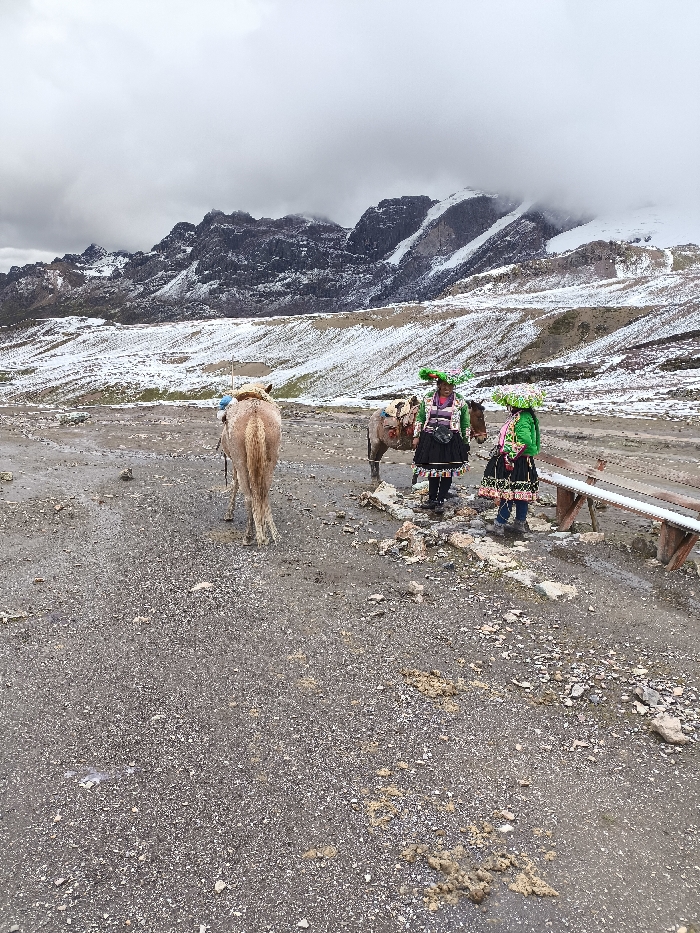 A rugged, mountainous landscape under a cloudy sky is lightly dusted with snow. In the foreground, a tan-colored llama walks away from the viewer, while two donkeys stand nearby. Two women in traditional Andean clothing, adorned with bright green headdresses and colorful textiles, stand next to the donkeys. The ground is rocky and muddy, and a simple wooden bench sits to the right. The scene conveys a sense of remote, high-altitude life.