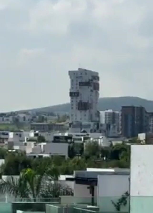 cityscape from the perspective of a rooftop. In the distance, there's a tall, modern building with a white facade and reddish-brown accents, partially obscured by clouds. A mountain range is visible in the background. In the foreground, there are rooftops of other buildings, some with glass railings and a few trees. The sky is light blue with scattered white clouds.