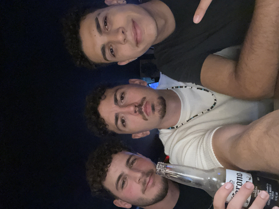 Three young adult males are depicted in a dimly lit, close-up photograph, likely taken indoors at a bar or similar social venue during nighttime hours