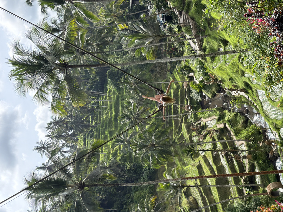 A woman in a swimsuit is suspended on a swing amidst a vibrant, tropical landscape. She is positioned above lush green rice terraces and towering palm trees. The scene suggests an adventurous activity, possibly in Bali, Indonesia, with the swing providing a scenic view. Bright sunlight illuminates the terraced fields and the surrounding vegetation.