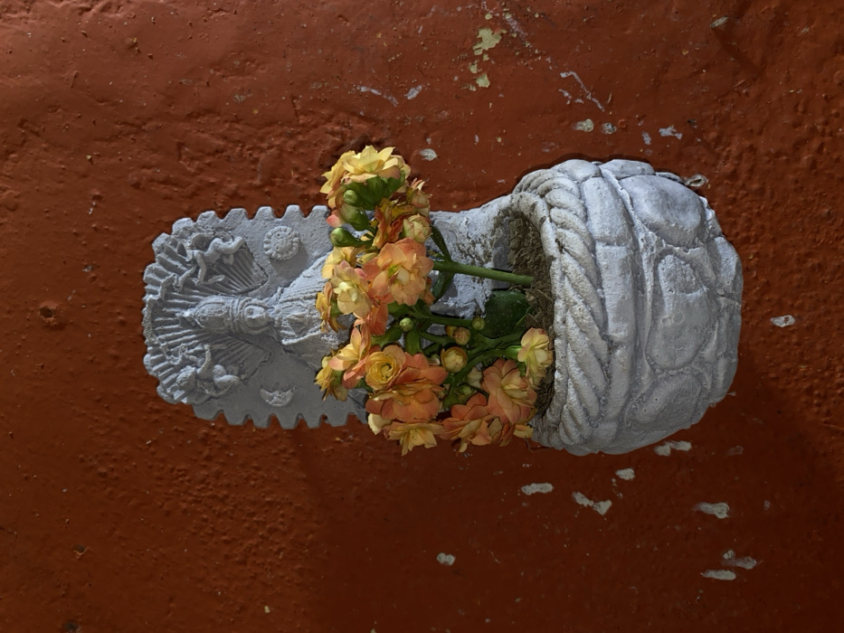 A gray, ornate wall planter sits against a textured, reddish-brown wall. Yellow and orange flowers spill from the planter's woven basket-like top. The base of the planter features a decorative, notched design with figures, possibly celestial beings. The scene is lit dimly, casting shadows and emphasizing the textures of both the planter and the wall. The composition is from an overhead perspective.