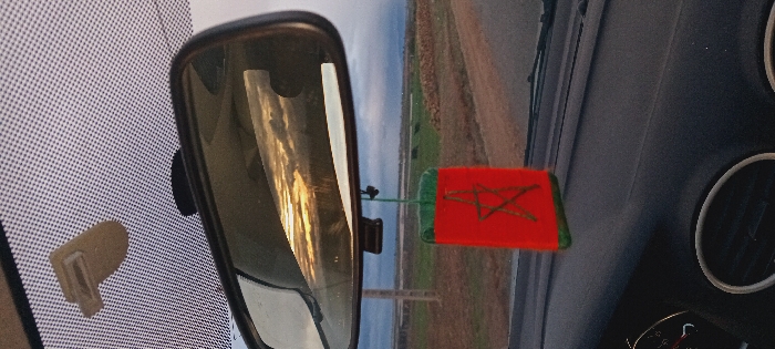 A car interior is shown. The rearview mirror reflects a landscape with water and sky. A red air freshener with a green outline and star design hangs from the mirror. Part of the dashboard is visible with circular vents. A beige object is attached to the windshield. The dashboard appears dark, and the reflection in the mirror shows an outdoor scene.