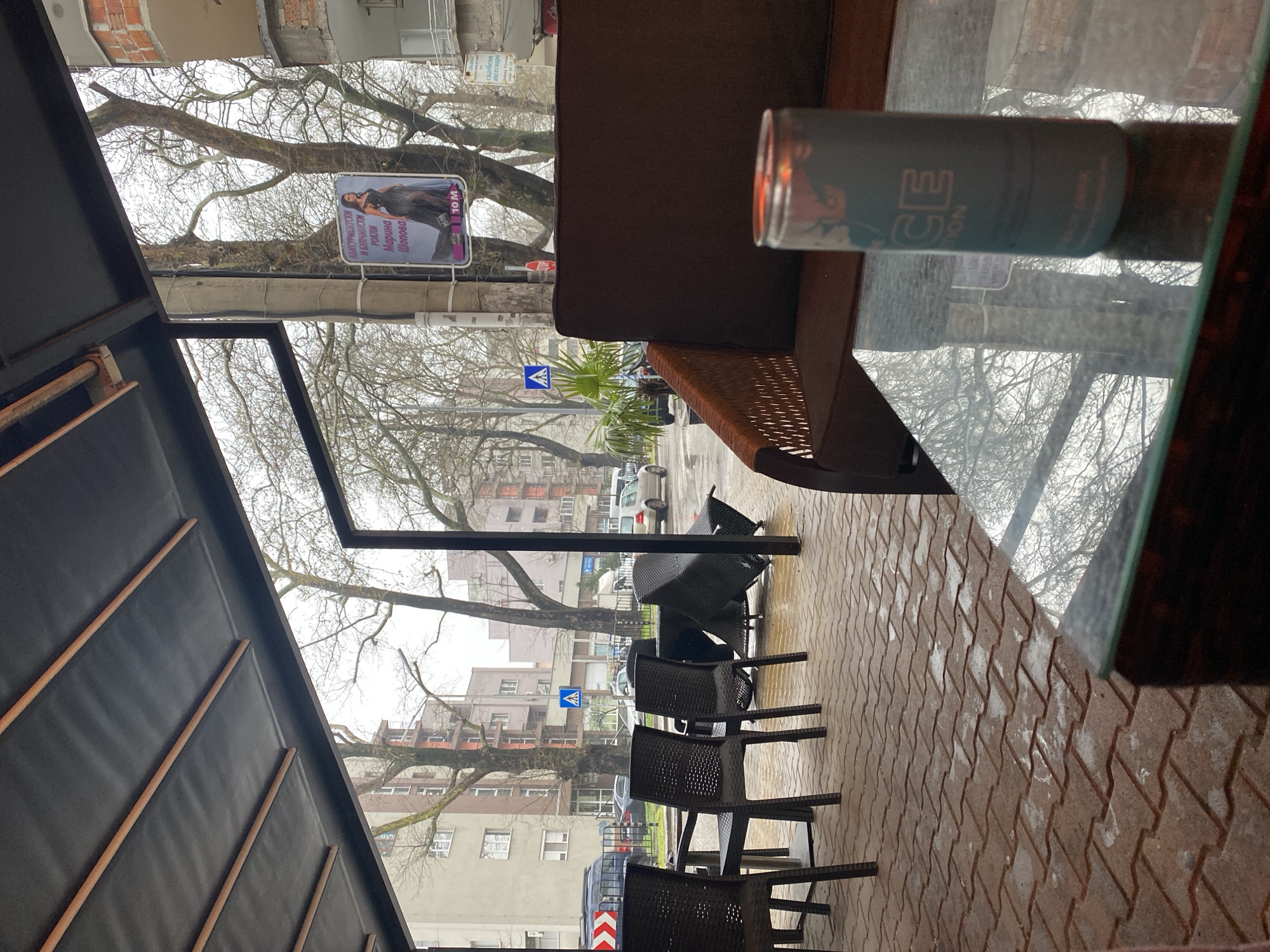 The image depicts an outdoor seating area of a cafe in Asenovgrad, Bulgaria, during a rainy day. Several black wicker chairs and a covered table with a glass top are visible. On the table, there is a cylindrical container, possibly a candle holder. The background shows a street scene with buildings, trees without leaves, parked cars, and a pedestrian crossing sign. A poster is attached to a utility pole in the background. The ground is wet, suggesting recent rainfall. The cafe seating area is partially covered by a black awning.