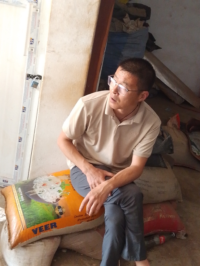 This image depicts a male individual seated indoors in Olomoda, Nigeria. The man, with short dark hair and wearing clear-framed glasses, a light tan polo shirt, and dark grey trousers, is positioned in the lower center, looking towards the upper right. His hands are resting on his lap. He is seated on a stack of sacks; the uppermost visible sack is orange, branded "VEER Indian Long Grain Parboiled Rice Product of India", and displays an image of cooked rice. To the immediate left of the man is a white door frame with a visible blue padlock secured to it. The background and right side of the frame reveal a dimly lit storage area containing numerous stacked sacks of varying colors (light-colored, blue, and red), along with a discarded plastic bottle visible on a concrete floor. The environment suggests a storeroom or a retail space for bulk goods.