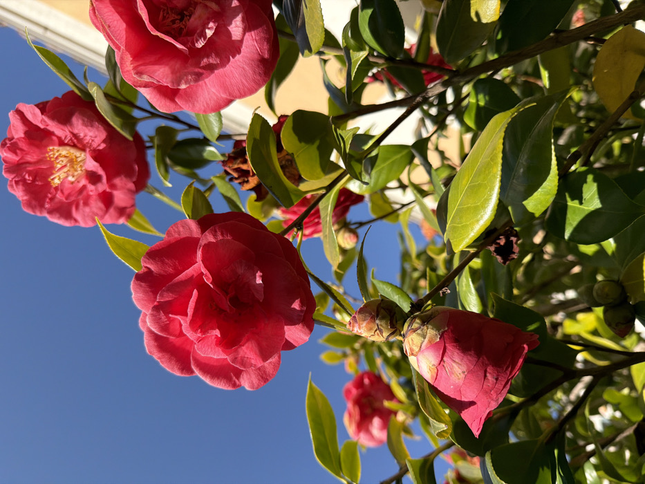 Vibrant red camellias in full bloom and bud are viewed against a clear blue sky