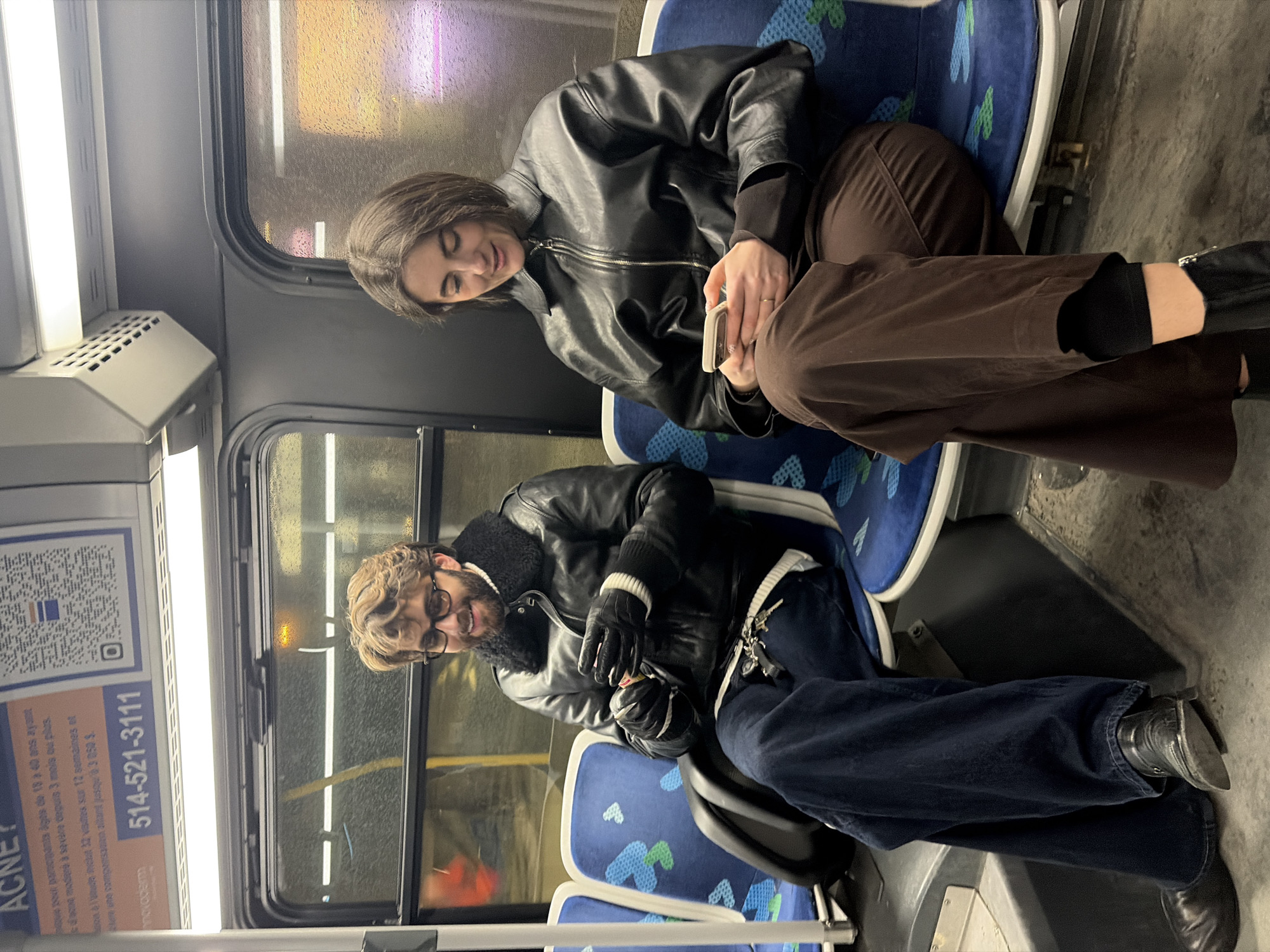 Two people are sitting next to each other on seats in a bus. The woman is on the upper seat and is looking at a smartphone. She wears a leather jacket and brown pants, as well as black boots. The man is on the lower seat and is holding a small wrapped object, possibly food. He wears glasses and a black leather jacket. There is an advertisement posted on the bus related to acne treatments and the advertisement lists a phone number with the area code 514, which is in Montreal, Canada. Rain is visible on the windows of the bus.