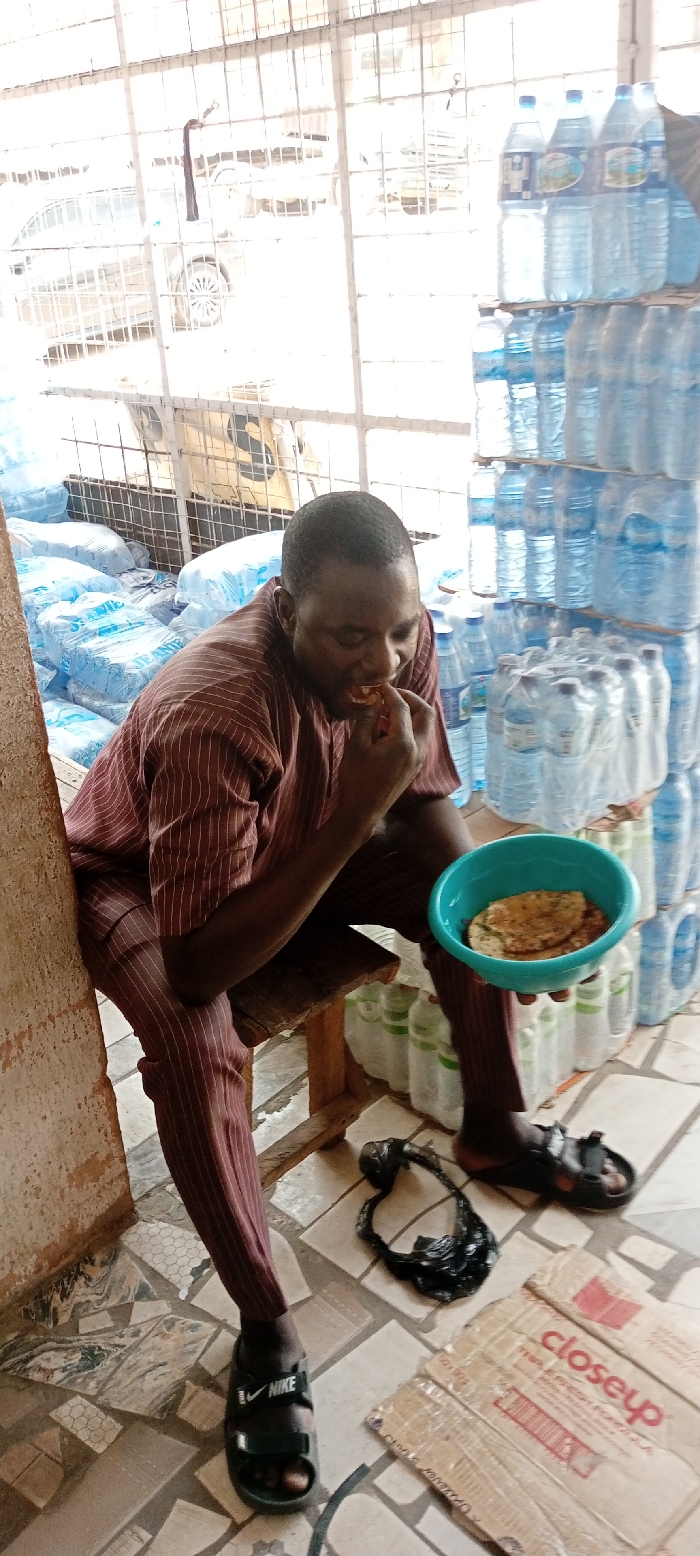 The image displays a dark-skinned adult male seated on a wooden bench inside what appears to be a commercial establishment in Gayawa, Nigeria. He is wearing a maroon striped long-sleeved shirt, matching trousers, and black Nike slides. The man is actively eating, bringing a small piece of food to his mouth with his right hand. His left hand holds a teal bowl containing two round, flat, cooked items. Behind the man, to his left, is a large pile of clear plastic sachets of water with blue labeling. To his right, numerous stacks of clear plastic water bottles, some large and some smaller, are vertically arranged. The floor is tiled with light-colored, patterned tiles. Near his feet, a crumpled black plastic bag and a cardboard box branded "closeup" are present. A light brown, rough-textured wall or pillar is positioned to his immediate left. Through a barred opening in the background, an outdoor area is visible under daylight, showing multiple vehicles, including a light-colored car, on a paved or dirt surface, with a dark vertical pipe or pole in the upper background.