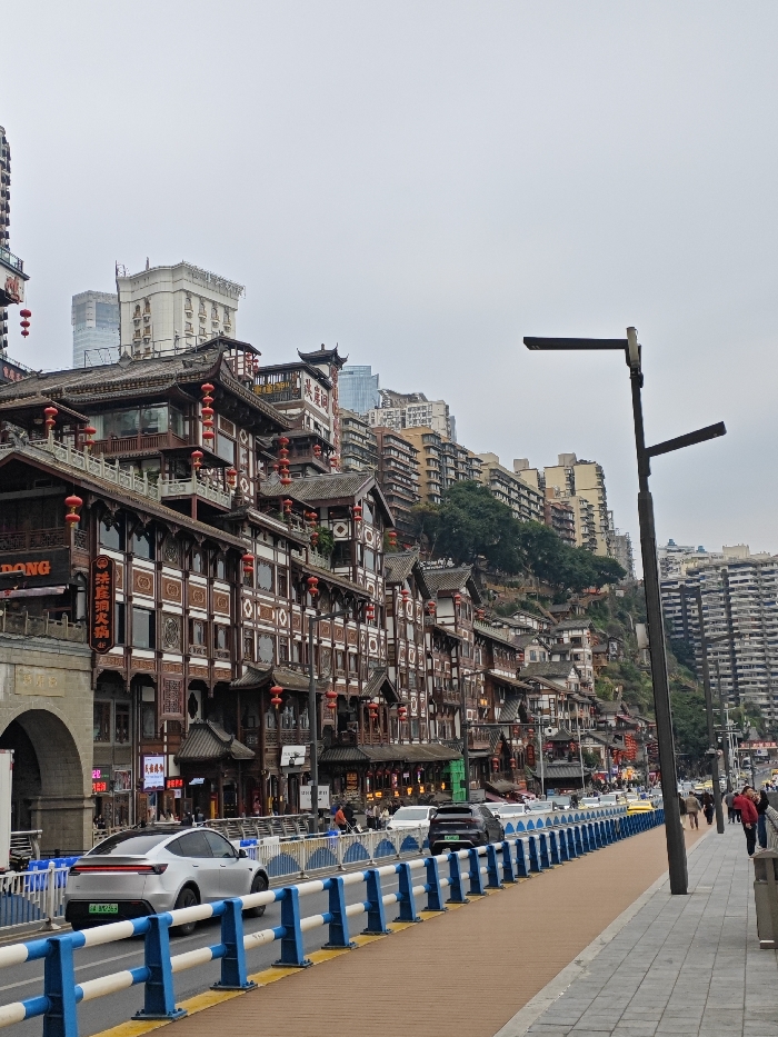 An outdoor, eye-level photograph depicts a bustling urban street scene in 江北城街道, China, under an overcast sky. The left side of the frame is dominated by a multi-tiered complex of buildings showcasing traditional Chinese architecture, characterized by dark wooden structures, intricate facades with white and brown patterned panels, tiled roofs with upturned eaves, and numerous hanging red lanterns. These buildings are built into a steep hillside, with modern high-rise buildings visible above and behind them, including a distinct white tower. Visible signage on the traditional buildings includes "LONG DONG" and Chinese characters that translate to "Hongyadong Hotpot." An arched stone structure is present at the far left base of these buildings. In the mid-ground, a multi-lane asphalt road stretches horizontally, separated from pedestrian areas by a continuous barrier system consisting of blue and white segments. Several vehicles are present: a silver electric sedan (with a green license plate) is prominent in the foreground lane, followed by a dark SUV. Other vehicles are visible further down the road. To the right of the barrier, a light brown paved path, likely a bicycle lane, runs parallel to the road. Adjacent to this path is a grey tiled sidewalk. A tall, black streetlamp with two horizontal, rectangular light fixtures stands prominently on the right side of the sidewalk. Several pedestrians, including individuals wearing red jackets, are walking on the sidewalk towards the background. The background on the right features a densely packed array of modern, multi-story residential and commercial buildings extending up the hillside, interspersed with some greenery. The overall atmosphere suggests a lively commercial and residential district with a mix of historical and contemporary architectural styles.