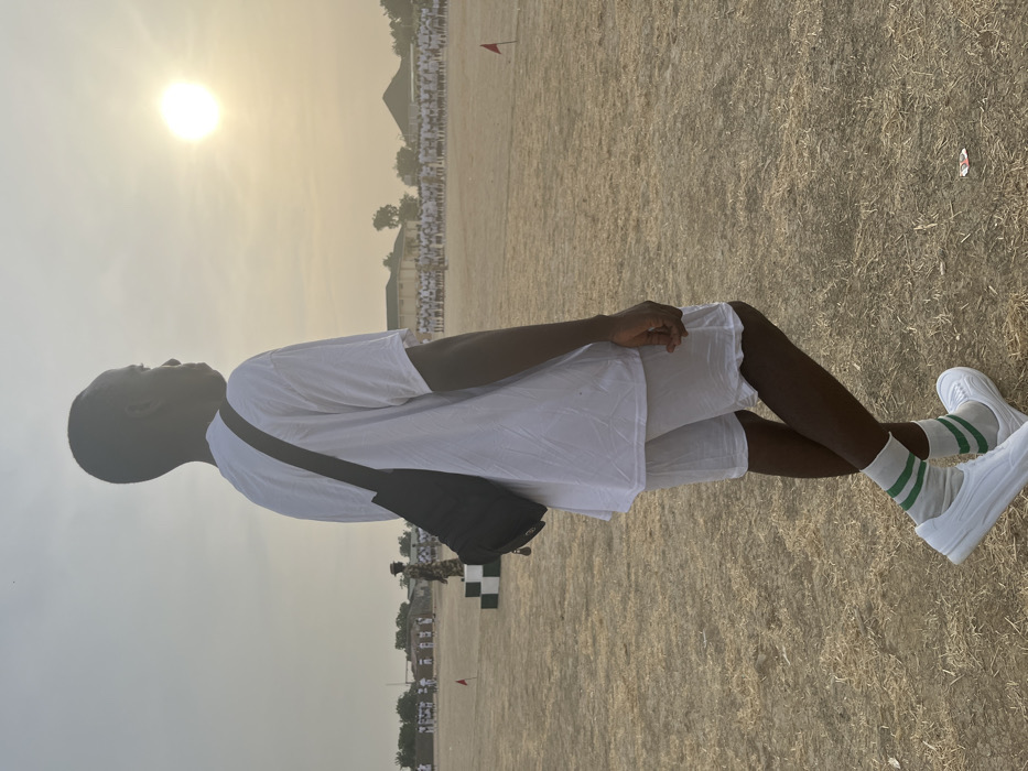 A person stands sideways on a field, dressed in white shorts, a white shirt, and white sneakers with green-striped socks. A black bag hangs across their body. The field is dry and grassy, extending to the horizon. In the background, a line of people in white uniforms stands in formation near some buildings. A few flags mark the field. The sun is bright in the sky, casting a warm glow.