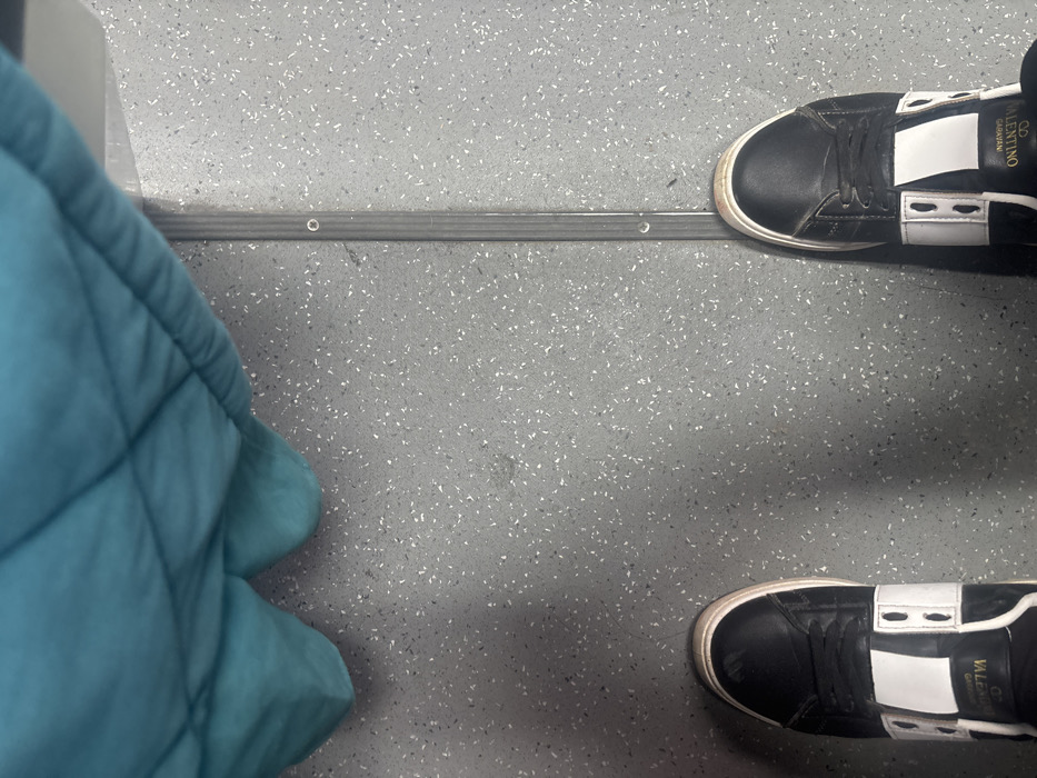 The photo displays an overhead view of a person standing on a gray floor with white specks. A blue quilted jacket or bag is partially visible on the left. The person is wearing black leather sneakers with white accents and the name "Valentino" printed on the side. A metal bar with evenly spaced holes runs horizontally between the jacket and shoes. The overall composition suggests a candid shot taken on public transport.