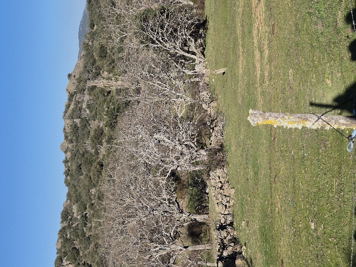 The image depicts a rural landscape in Collado del Mirón, Spain, under a clear blue sky. In the lower center foreground, a weathered wooden fence post, visibly covered in yellow and white lichen, stands upright. Barbed wire is affixed to the post, from which a blue plastic loop or tie is also suspended. The immediate ground consists of a field of green grass. Across the midground, a line of mature, leafless deciduous trees with light-colored bark and intricate branching patterns is present, positioned behind a low, dry-stacked stone wall. The background is dominated by a rocky hillside densely covered with dark green evergreen trees and shrubs, with exposed grey rock formations. A faint outline of a distant mountain range is visible on the far right horizon. No human subjects or discernible activities are observed.